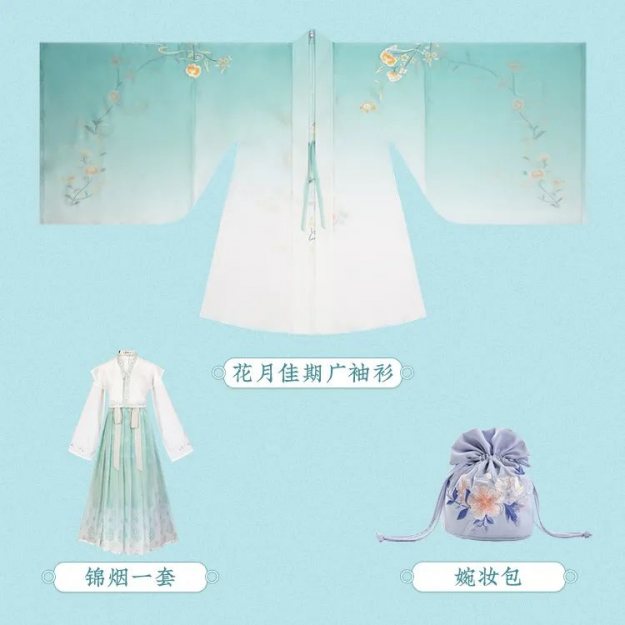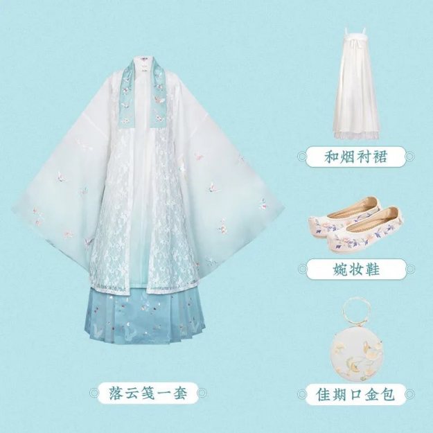 低调中的奢华!选渐变的落云笺准没错!和烟衬裙在夏季单穿也是不错的选择哦~当然如果放在落云笺里作为打底,也是很出彩的!婉妆鞋的花纹缠绕,温婉柔美。浅色佳期口金包则成为了整套的点睛之笔~