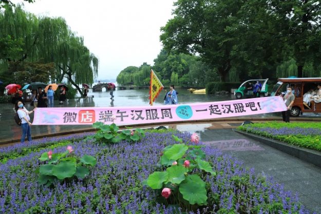 6月27日,微店及西湖小游伴联合百位汉服达人在杭州西湖举行了一场主题为「一起穿汉服吧」的汉服文化活动。百位汉服达人身着汉服环游西湖,并乘坐游船登岛小瀛洲。通过现场直播、互动答题、线上集市等形式,弘扬传统文化,为汉服、故宫美妆等文化类商家带货。