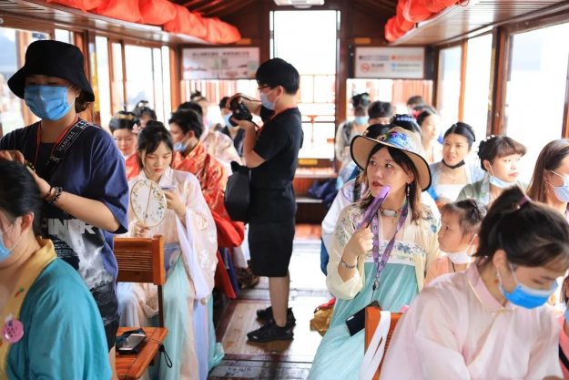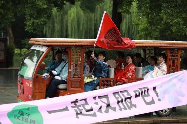 百位汉服达人于上午10:30从涌金门的西湖“世界遗产”地标出发,乘坐G20同款仿古观光车环游西湖。