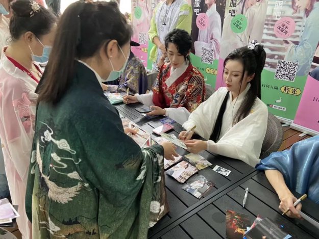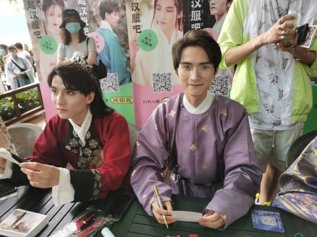 最后,汉服达人们来到了西湖音乐喷泉附近的西湖礼物三号亭,为粉丝和汉服爱好者们进行了一场现场签售活动。