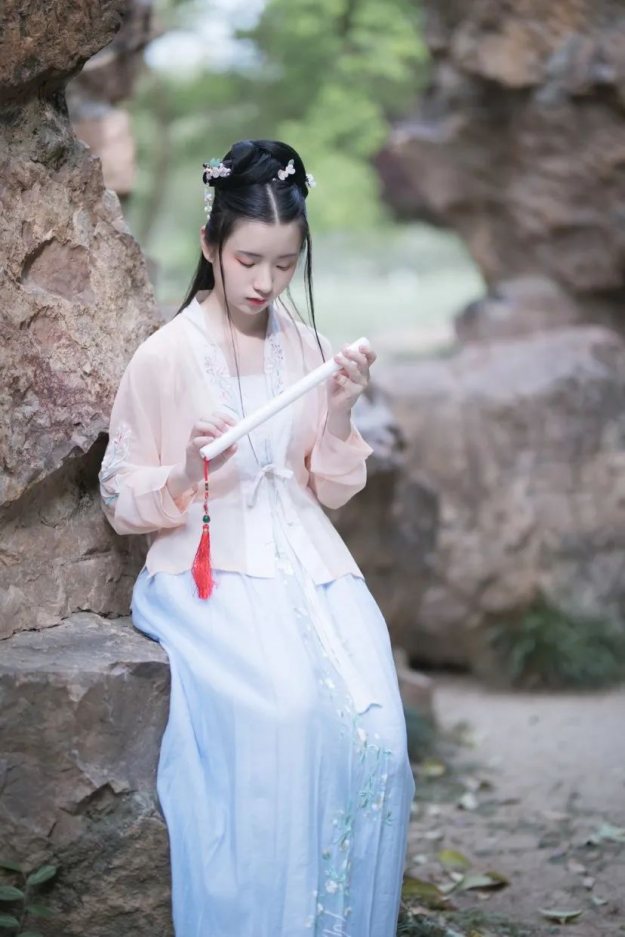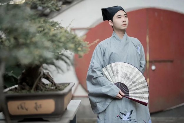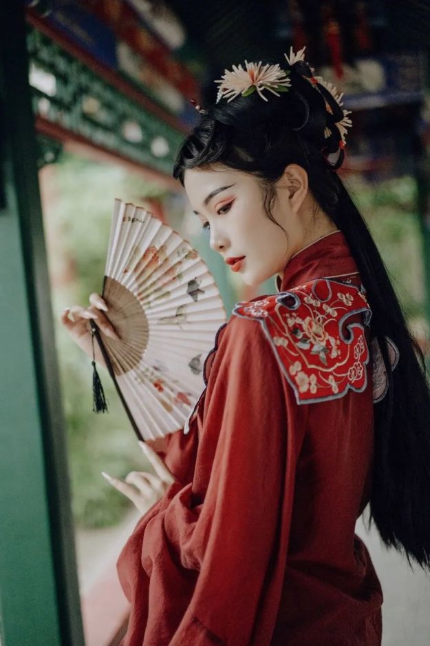 也可以把扇子放在身前,微微抬头,遥看远方。男袍子、女袍子放的扇子位置不一样,传递出来的感觉也不一样~