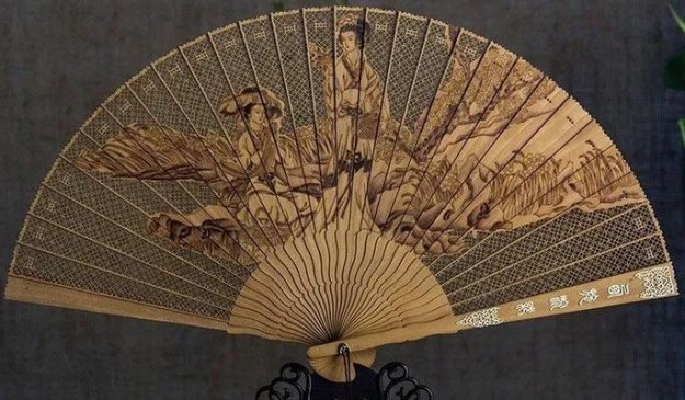 我国秦汉以后,扇子的形制主要有方、圆、六角等形,扇子的面料采用丝织的绢素,由于宫中用得多,故又称“宫扇”,隋唐两代,盛行于世的主要是纨扇和羽扇,以及少量的纸扇。宋以后,折扇渐渐流行。明清时期,浙江、苏州、四川等地盛产折扇,题字作画亦兴于此。这一精湛的技艺从明代开始传入欧洲,然后风行世界。