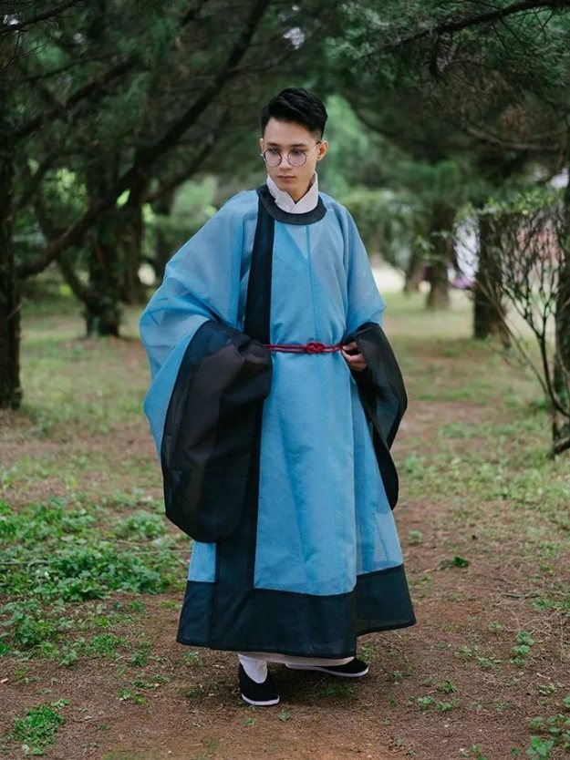 襕衫,宋制衣身多为白色或米白色,明制为玉色、蓝色或青色,又称蓝衫。上下通裁,圆领,宽袖,袖口多敞口,明制也有收口的。衣身两侧开衩,宋制下摆接横襕,《集韵》说:“衣与裳相连曰襕。”明制大多不接横襕,而在开衩处接外摆。衣领、衣袖、衣襟等处都缀有黑色或深青色缘边,明制衣身底边衣缘较宽,取代接襕。