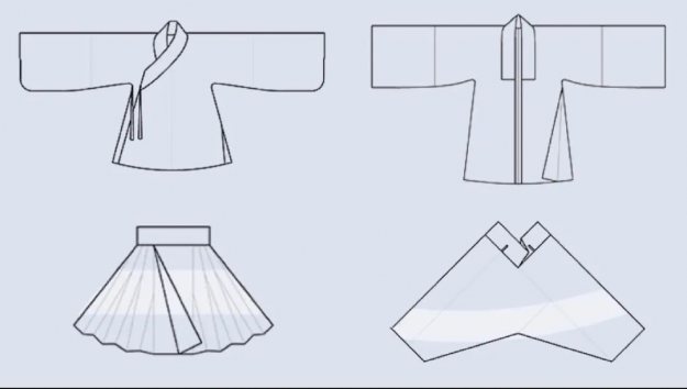 袴:宽裤腰,窄裤腿,裤长随穿着者需要而定。裤腰处缀有系带。