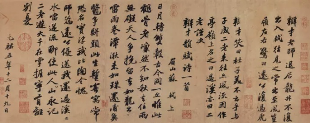 书写此卷的时间大约在翌年。其诗苍劲沉郁,饱含着生活凄苦,心境悲凉的感伤,富有强烈的感染力。其书也正是在这种心情和境况下有感而出的,故通篇起伏跌宕,迅疾而稳健,痛快淋漓,一气呵成。苏轼将诗句心境情感的变化,寓于点画线条的变化中,或正锋,或侧锋,转换多变,顺手断联,浑然天成。其结字亦奇,或大或小,或疏或密,有轻有重,有宽有窄,参差错落,恣肆奇崛,变化万千。笔酣墨饱,神充气足,恣肆跌宕,飞扬飘洒,巧妙地将诗情、画意、书境三者融为一体,体现了苏轼“我书意造本无法,点画信手烦推求”的创作状态。难怪黄庭坚叹曰:“试使东坡复为之,未必及此。”