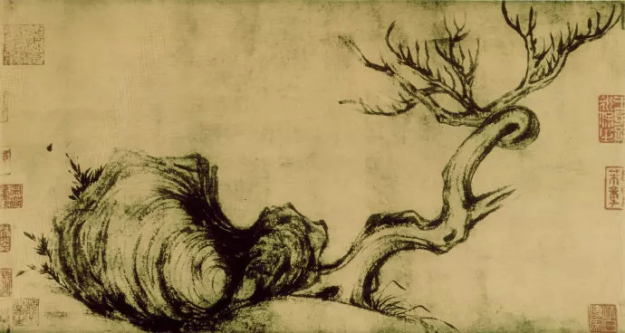 该画作画面内容很简单,是一株枯木状如鹿角,一具怪石形如蜗牛,怪石后伸出星点矮竹。用笔看似疏野草草,不求形似,其实行笔的轻重缓急,盘根错节,都流露出苏轼画作很深的写意功底。