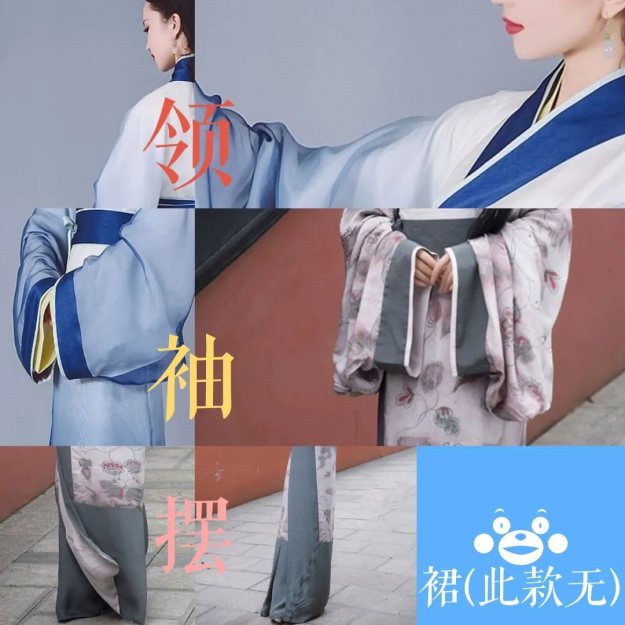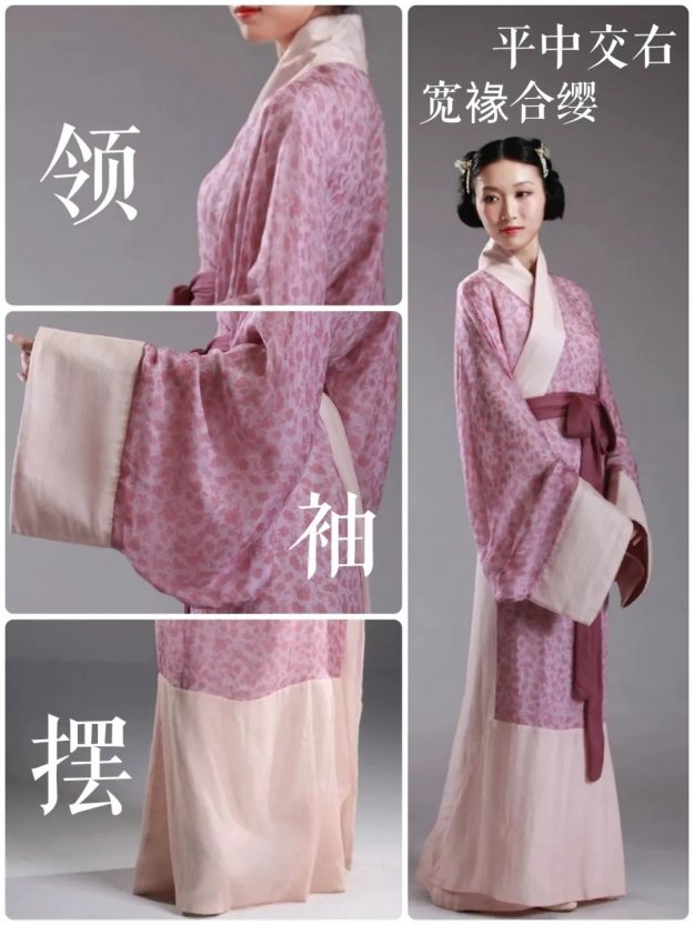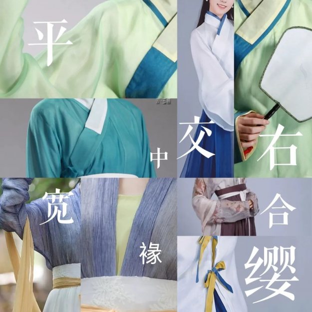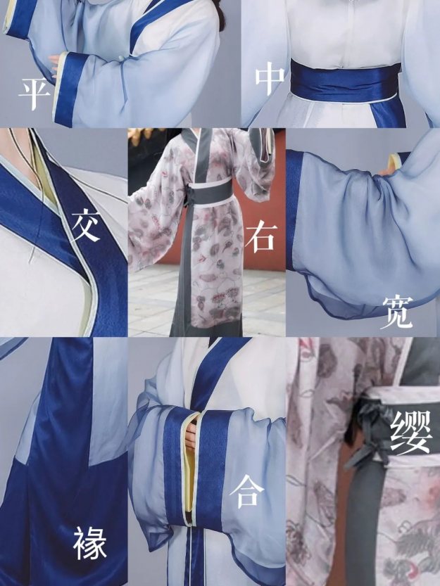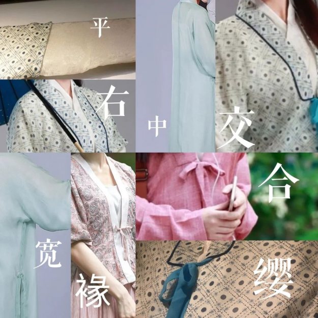 『现代汉服』微信公众号提出的汉服共性“八字诀”——平、中、交、右;宽、褖、合、缨,同样适用于这一类汉服,《实用汉服图志》将根据个人理解,尝试应用于具体款式的鉴赏,文末附有相关概念的详细阐述文章,请自行参考、对比、理解,图中不再赘述。