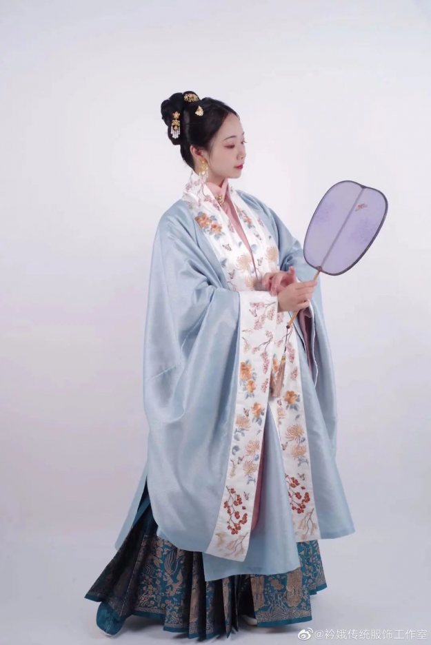 而另外一种对襟竖领披风直至明末开始流行起来,这款披风领口缀一对小纽扣,胸前衣襟处亦用系带或玉花扣。