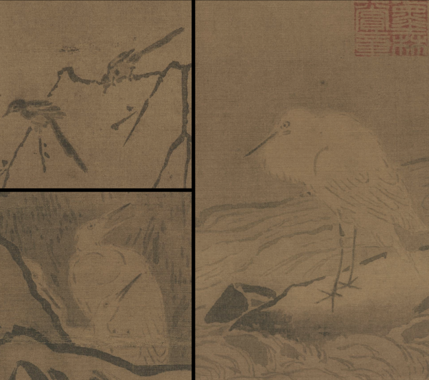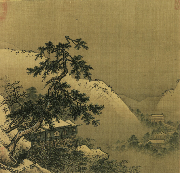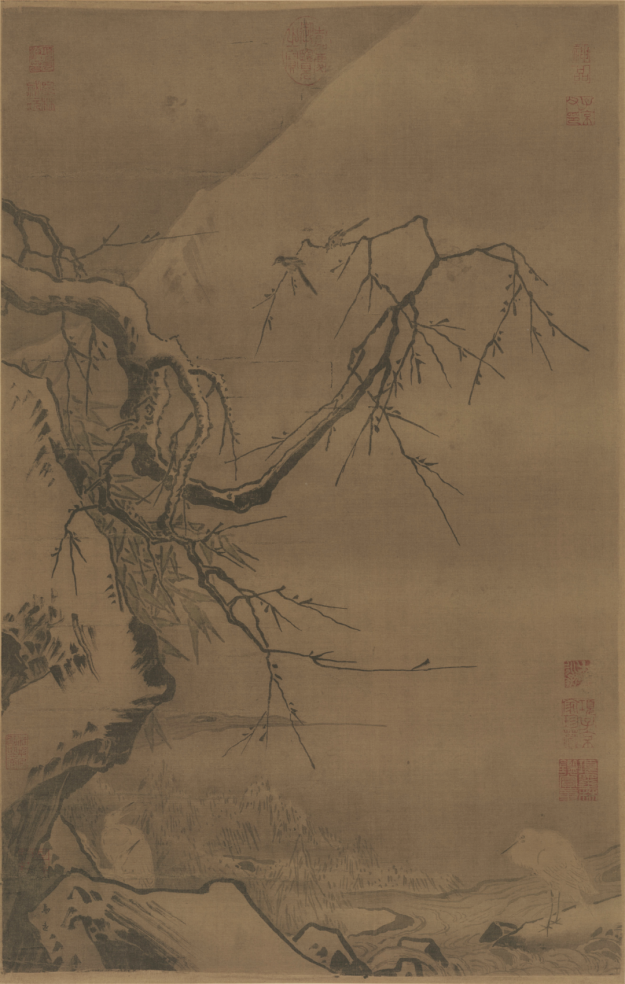 这次选的前三幅画均出于南宋画家马远之手。后一幅虽没有留下作者的姓名,从近处山石,以及湖滨老梅的拖枝画法,应也属于马远一派的作品,台北故宫博物院考证为宁宗至理宗朝的画院佳作。