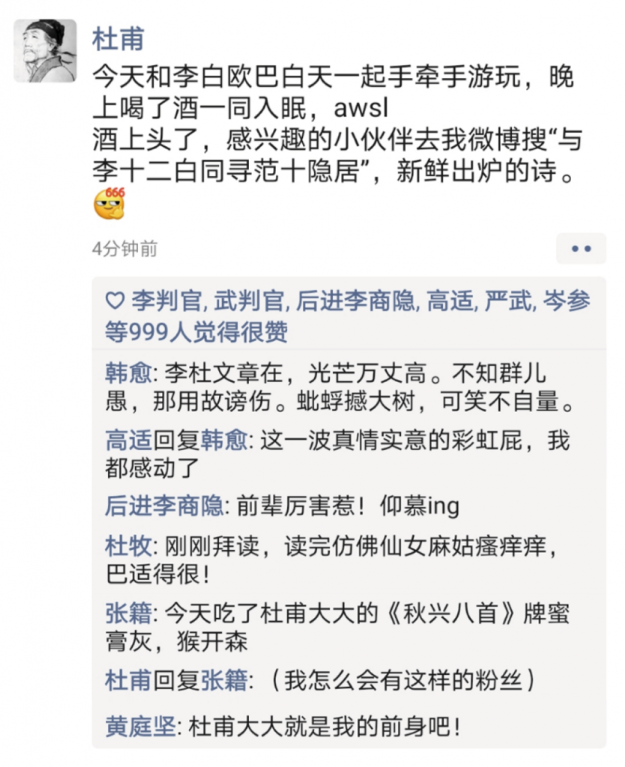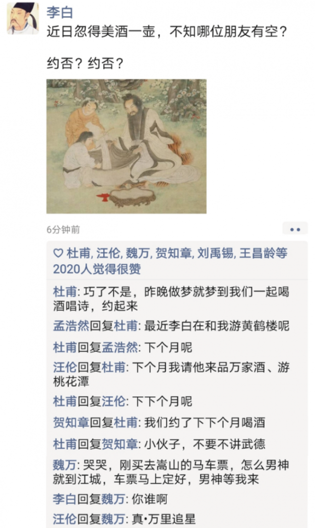 通过这些诗,可以看到,杜甫在追星路上真正做到了为你写诗,为你静止。甚至在李白因为参与永王叛乱,失败后被流放了,杜甫仍然站出来为李白打call,愿为他背叛全世界:
