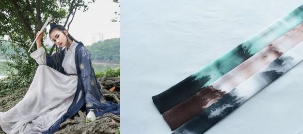 男士汉服通常的风格是高远宁静,宛如山水画。因此,发带也要选择与之相对应的水墨风格,用印花的最好,山水、云海、人烟等等。