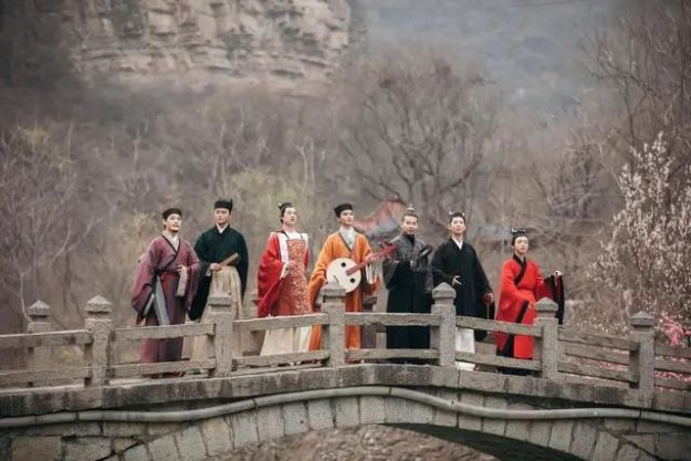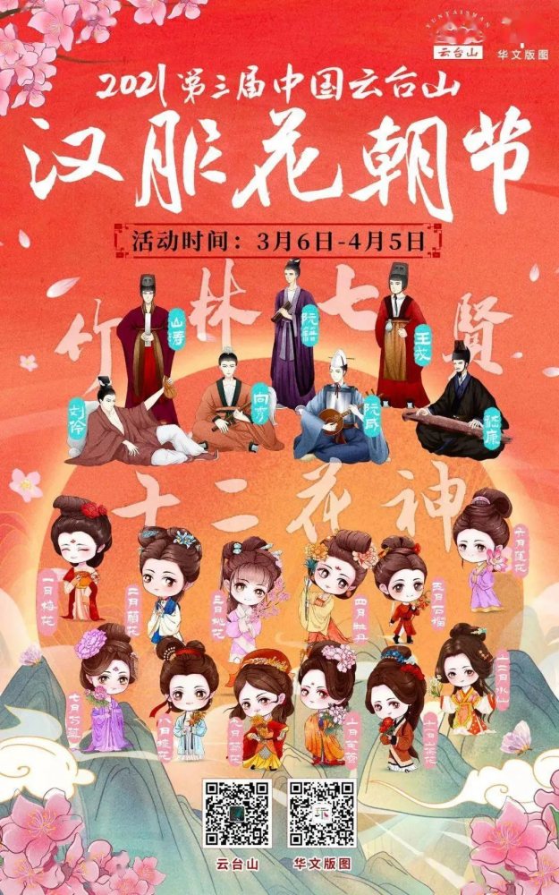 整场活动最具视觉冲击力的当属由汉服推荐官及汉服形象大使扮演的竹林七贤与十二花神:竹林七贤或纵歌放酒或清谈自在,他们穿行峡谷之间,游走泉瀑溪潭,风流率意、常超然物外,为我们展示了历史长河中巾帼名仕的潇洒风骨和飘逸风姿。十二花神则身着各式汉服翩然而至:寒梅傲骨冰清,雪杏娇姿盈盈,桃花灼灼绚丽,石榴丽质煜明,牡丹雍容无双,芙蓉冷艳寒江,水仙冰魂玉魄,金莲亭亭荷塘,山茶丰姿繁香,陶菊淡雅孤芳,丹桂幽香翩绵,蜀葵秾艳红妆……令人悦其姿色而知其神骨。他们跨越时空雅聚在春日的云台山,受邈邈烟云供养,仿佛柳烟花雾的山水里一幅疏影清浅的美妙画卷。