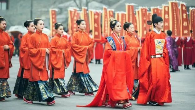 汉式婚礼仪仗方阵身着或富丽堂皇,或古朴大方的各朝代婚服,隆重地展示了华夏传统服饰极具内涵的文化意蕴与和谐含蓄的审美意蕴,彰显出汉式婚服的独特魅力。