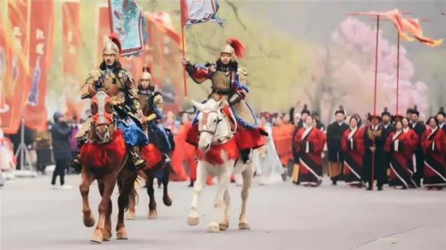上午10:00点,在响彻云霄的铿锵鼓乐中,身着甲胄的迎宾骑手驾着数匹风姿矫健的骏马逐风而来,气势磅礴的首仪仗方阵手持鲜明的旗帜紧随其后,为开幕式巡游作出了精彩绝伦的震撼开场,正式拉开了第三届“中国云台山汉服花朝节”的帷幕。