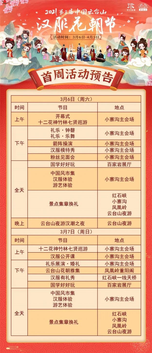 2.2021第三届中国云台山汉服花朝节期间,每周六、周日还有“穿汉服,免门票”抢票活动,关注“云台山景区”、“华文版图”微信公众号,敬请期待!