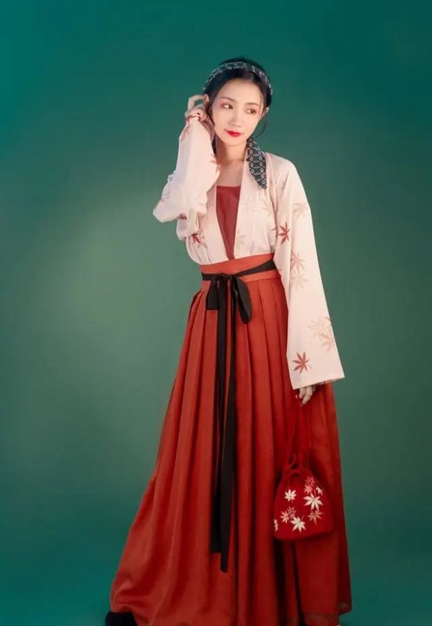 这一套汉服的颜色非常鲜艳,属于那种特别亮眼的枫叶红,这个颜色就比较适合秋天的时候穿,尤其是在上衫上面还有很多精致的枫叶印花。在秋天的时候穿这样的一套衣服到枫叶林拍照的话一定非常好看。