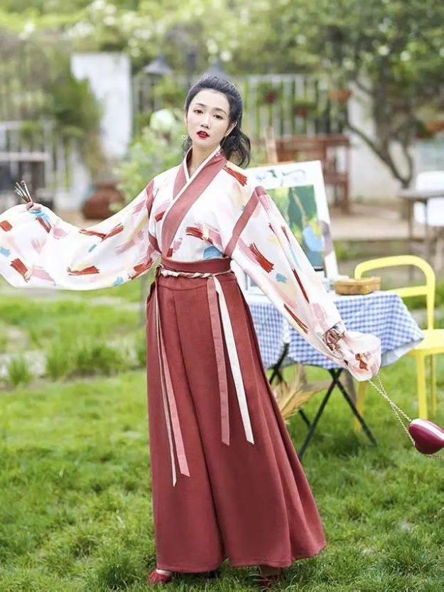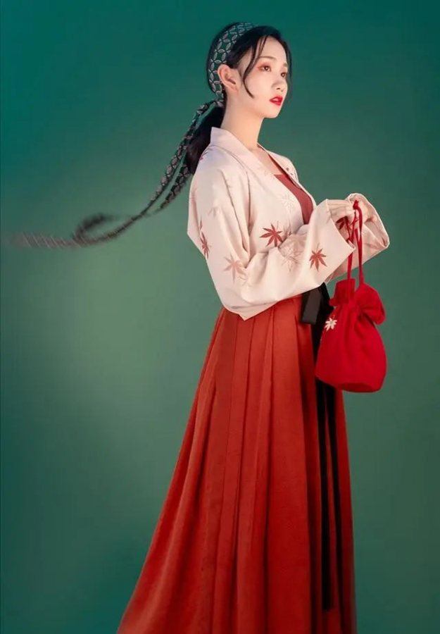 整套衣服的设计非常简单,除了上衫的印花之外其他的部分都是纯色的,并没有我们日常见到的那些汉服那样隆重。而且这一套衣服的三件单品无论哪一件都可以拿来单穿,尤其是带有枫叶印花的上衫,当作一件外套来穿也是非常好看的。