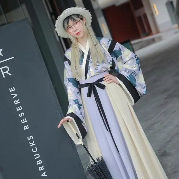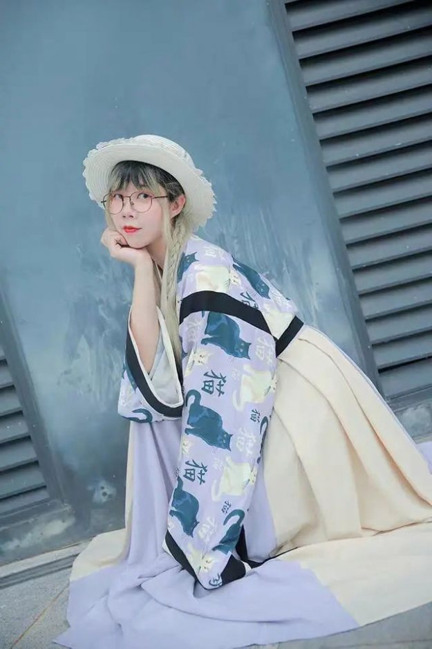 这几年猫咪图案的衬衫非常流行,几乎达到了人手一件的程度,这一套汉服的上襦的图案就是非常可爱的猫咪图案。我们日常见到的汉服都是用非常有古典特色的布料做成的,这种时装面料做的汉服还是比较少见的,时装和古典碰撞在一起,竟然一点都不显得违和,反而给人一种非常时尚的感觉。
