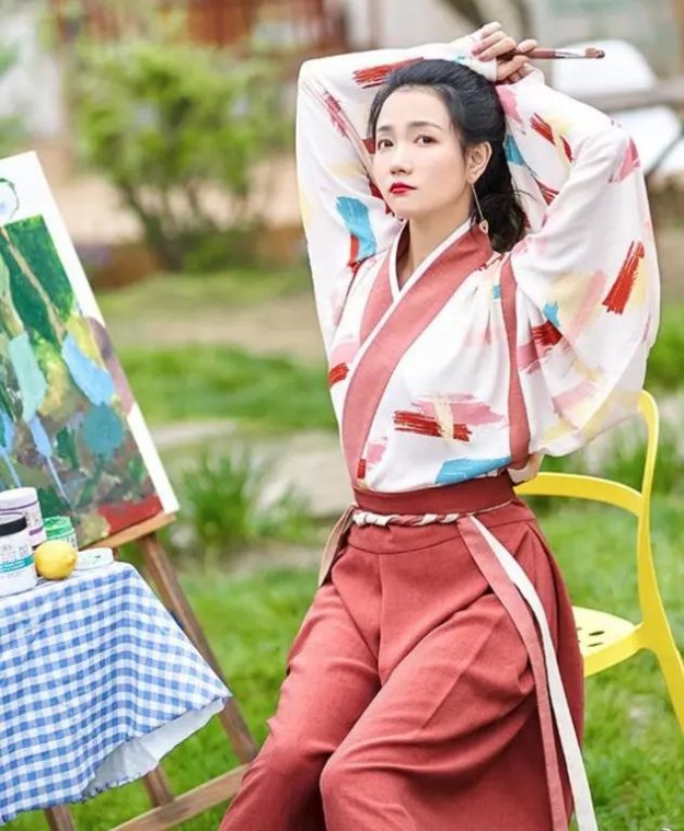 整套汉服的配色比较清新,上衫是以白色为底色,搭配一些彩色的涂鸦图案作为装饰,这些涂鸦的形状就像是笔刷一样,看起来十分随意。这种彩色的图案也让上衣看起来更加生动活泼。下半身的宋袴则是比较简单的纯色裤子,这样可以更加清晰地将上衫的风格衬托出来。