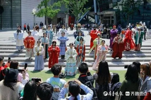 五一假期,舒秋红与同袍们在泉城路上推广汉服文化,吸引了不少市民驻足。