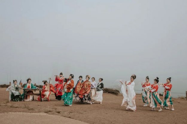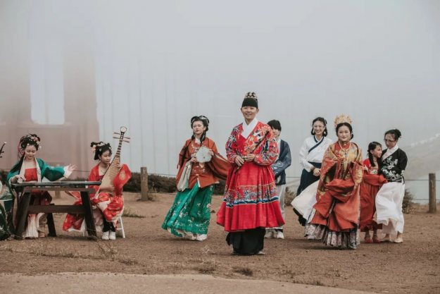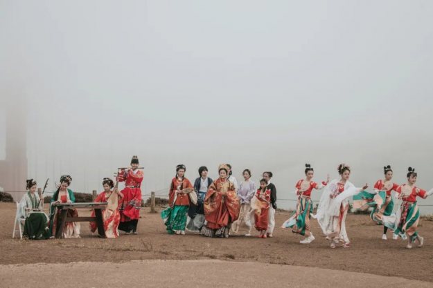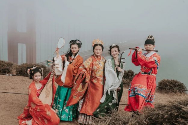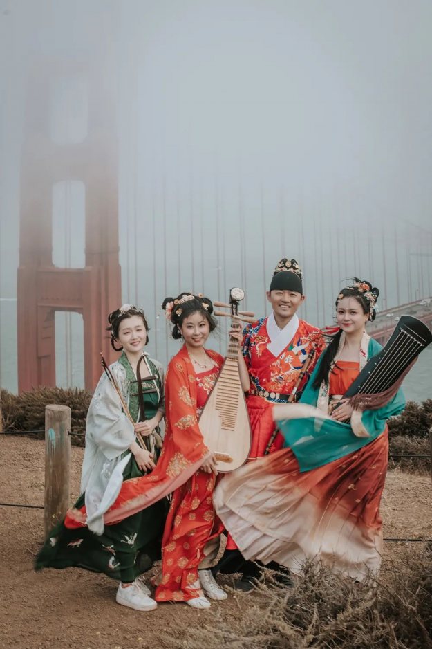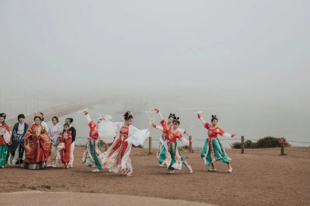 婷婷袅袅的唐代服饰舞者、悠扬的琵琶二胡笛子、身着明代吉服的领唱,近三十位身着中国各朝传统服饰的汉服爱好者齐聚一堂,演奏民乐唱歌跳舞,这不是穿越了,而是7月24日北加州汉服社中秋快闪空降金门大桥,精彩的中国传统曲目《彩云追月》引起了在场众多游客的围观与喝彩。
