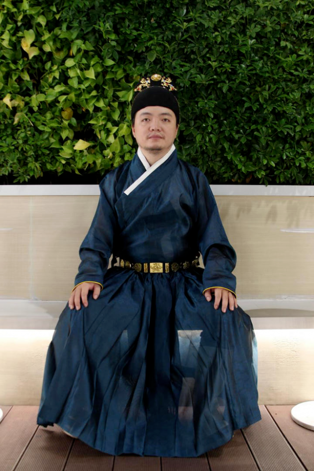 邓力给自己选了一套深蓝色绸缎汉服:明制贴里,加了窄护领和百褶裙。他坐着地铁、穿过马路,和陌生人擦肩,然后走进咖啡馆与我们见面,没有被围观,也没有被投射异样的目光。