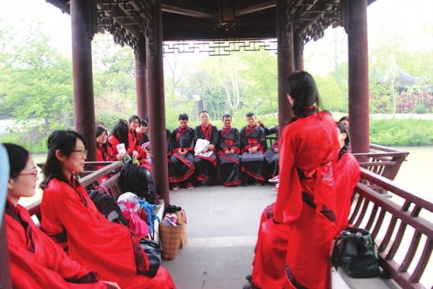 不管是图新鲜还是害羞,既然来了,那当然一个都不能放过。在主持人梅雨的带领下,一行人来到了枫桥景区中的“一枝园”中,这个小花园兼具了苏州的小巧玲珑,事不宜迟换衣服。女孩穿红色的,男孩穿黑色。男女生们煞有介事的开始着装,不少男同胞开始手忙脚乱起来,围裙当了披肩,束腰当了领结,顷刻间汉服穿出了各种现代风味。看见这“惨不忍睹”的场面,梅雨实在看不下去,手把手地教了起来。