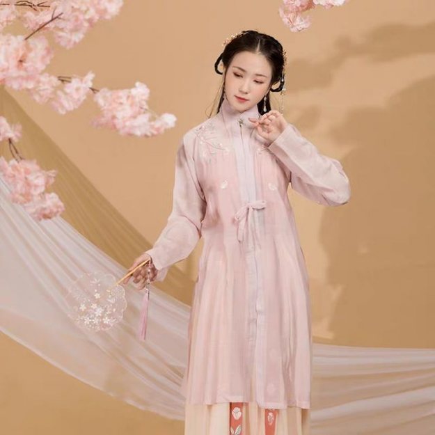 从图片中我们可以看得出来,这是一件直袖的立领衫,颜色是非常浅非常温柔的粉色,穿在身上也会将人衬托得更加温柔。因为这件长衫布料垂感比较好,再加上衣服长度比较长,所以穿在身上也就显得格外苗条纤细了一些。