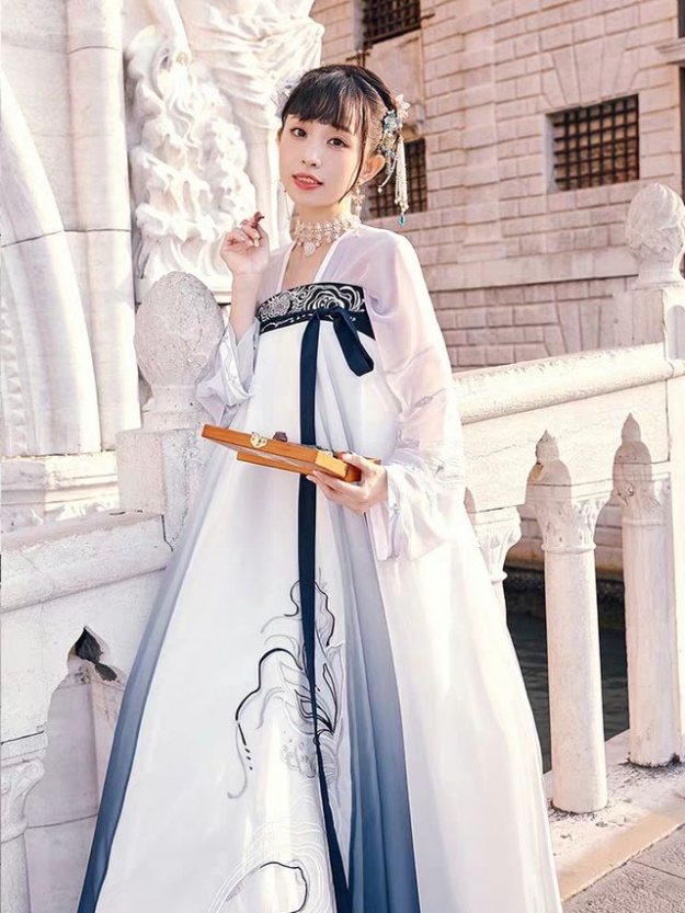 坦领汉服的上半身是由两件领口开得比较大的上衣组成的,一件半臂一件长袖,这样搭配起来会更加与层次感。对于一些有锁骨的女生来栓,坦领真的非常友好,可以让人看起来十分性感。当然了,没有锁骨也没有关系,反正坦领汉服穿在身上本身就是十分显瘦的。